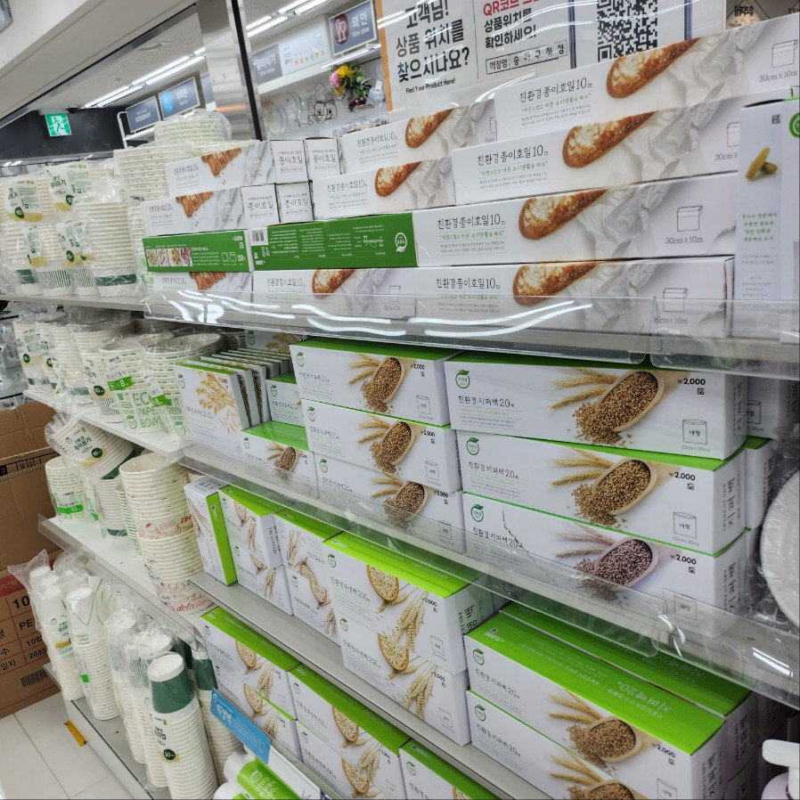 다이소에 가면 친환경 제품 코너가 따로 마련되어 있는데요. 특히 종이컵이나 호일 등 1회 용품들을 친환경으로 사용하면 좋잖아요? 다이소 제품이라 가격도 착한데 좀 더 환경에 좋은 제품이라고 하니 일단은 기분 좋게 사봅니다.