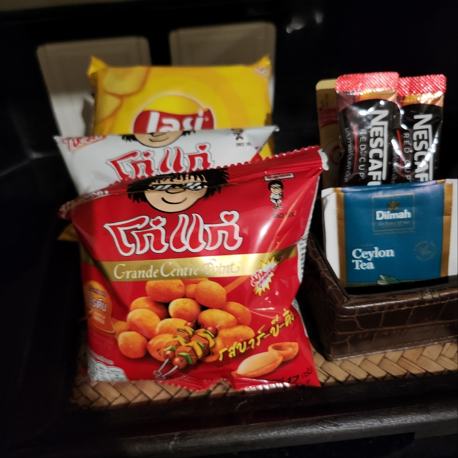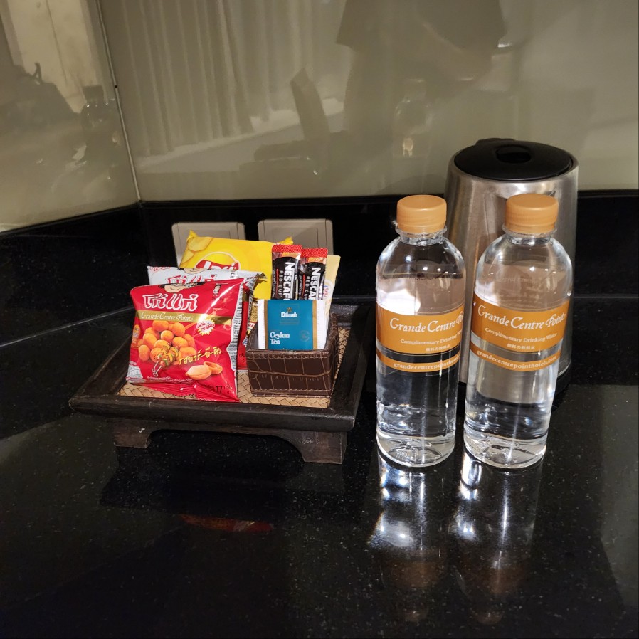 한켠에 조리를 할 수 있는 작은 조리대와 싱크대, 냉장고가 있고, 룸에 따라 어떤 조건인지는 모르겠으나 제가 묵은 그랜드 스위트룸은 미니바가 무료였습니다^^ 미니바라고 해봐야 스낵과 물, 차, 커피, 콜라와 음료 정도가 다였으나 그래도 밤에 도착해서 간단히 허기를 달래주기에 좋았네요.