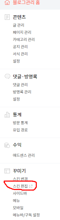 꾸미기에서 스킨편집에 들어가 줍니다.