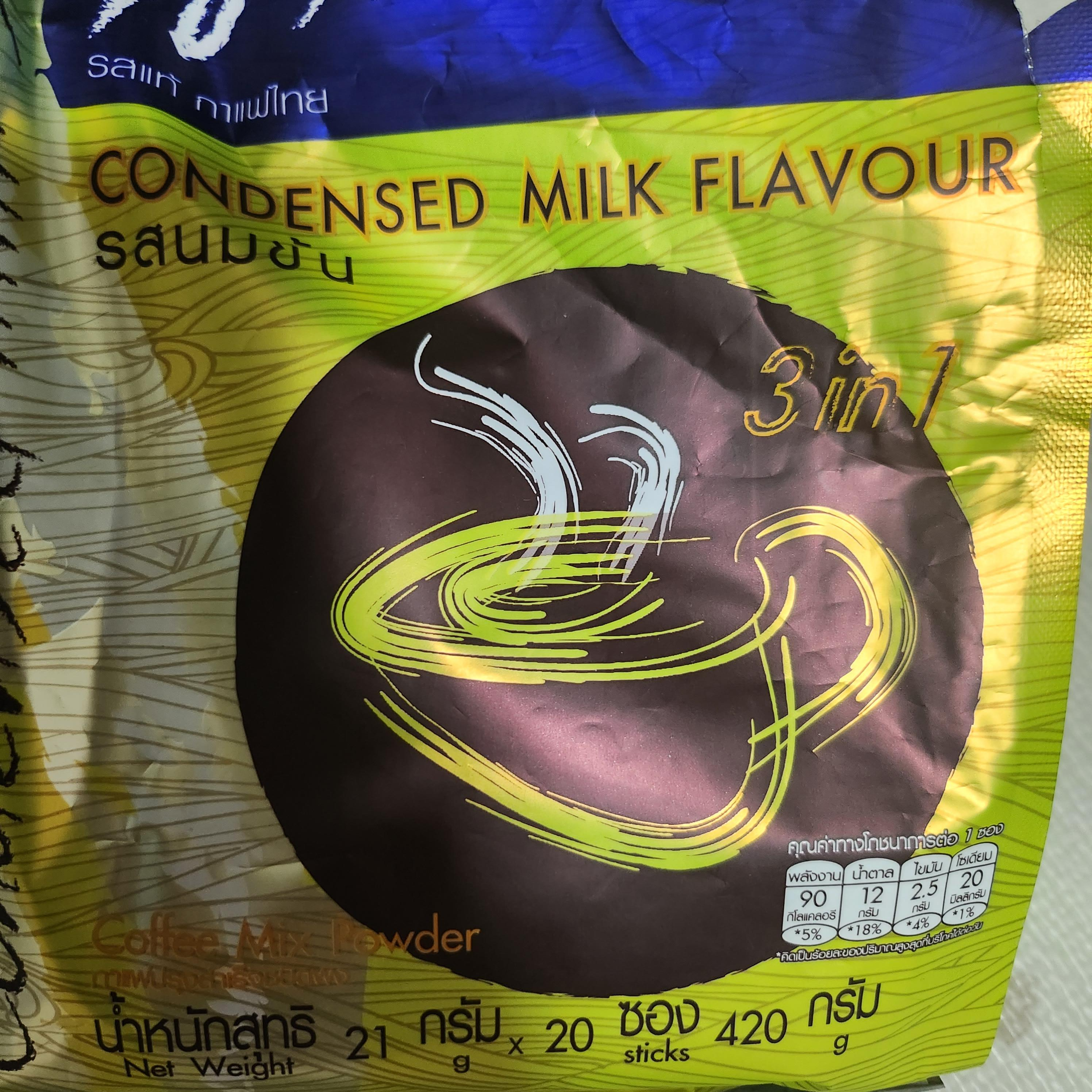 3in1이라고 적혀있는건 파우더 안에 커피,설탕,프림 세가지가 다 들어가 있다는 의미라 그대로 물만 부어드시면 된답니다. 요게 바로 연유 condensed milk flavor 믹스 커피입니다. 칼로리는 90칼로리인가봅니다. 생각보다 칼로리가 높지 않네요.